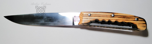 Manche en frêne clair légèrement brûlé, inclusion de charbon de bois, mais pas n’importe lequel : il provient de la forge, et il s’agit de morceaux non brûlés ayant servi à forger la lame. Le tout est stabilisé à la résine epoxy translucide. Lame forgé en acier XC-75.